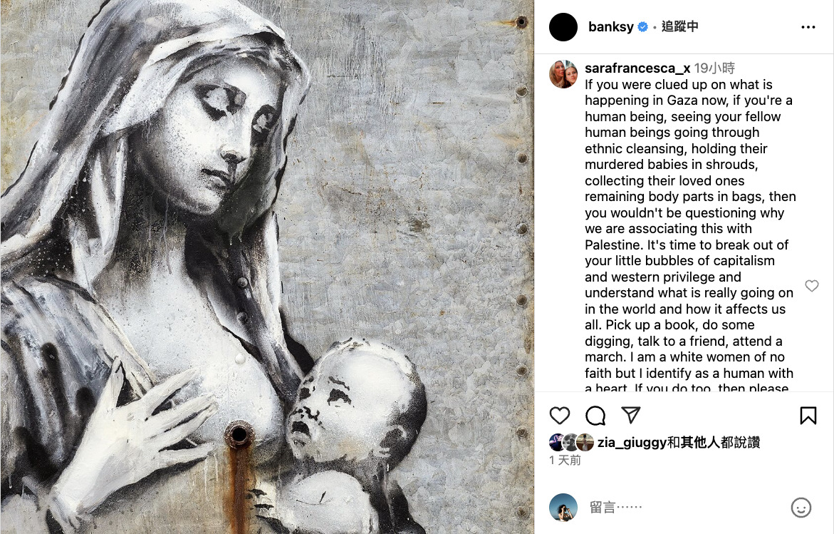 英國知名藝術家 Banksy 昨天在 IG 上,發表了一幅引人注目的新作。這幅作品描繪聖母的乳房流出宛如彈孔下的血水,而她懷中的嬰兒則以驚駭的表情注視著這一切。畫面震撼,引發了廣泛的討論和爭議,昨天看還有大量的網友留言,今天再看,發現那篇貼文已經關閉留言功能了(目前又重新開啟)。