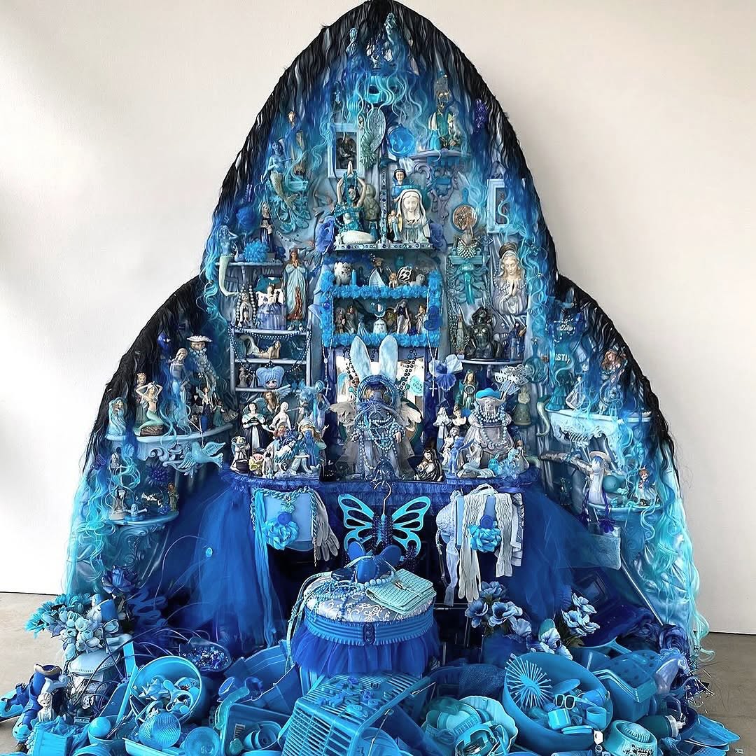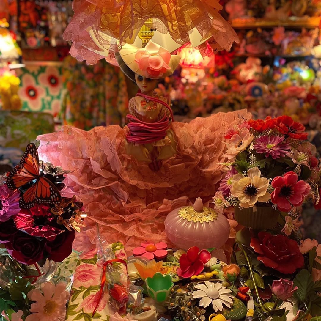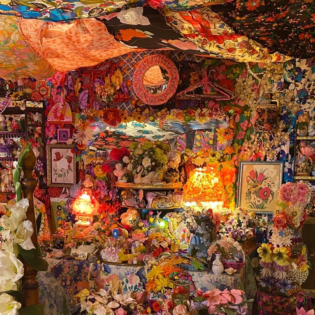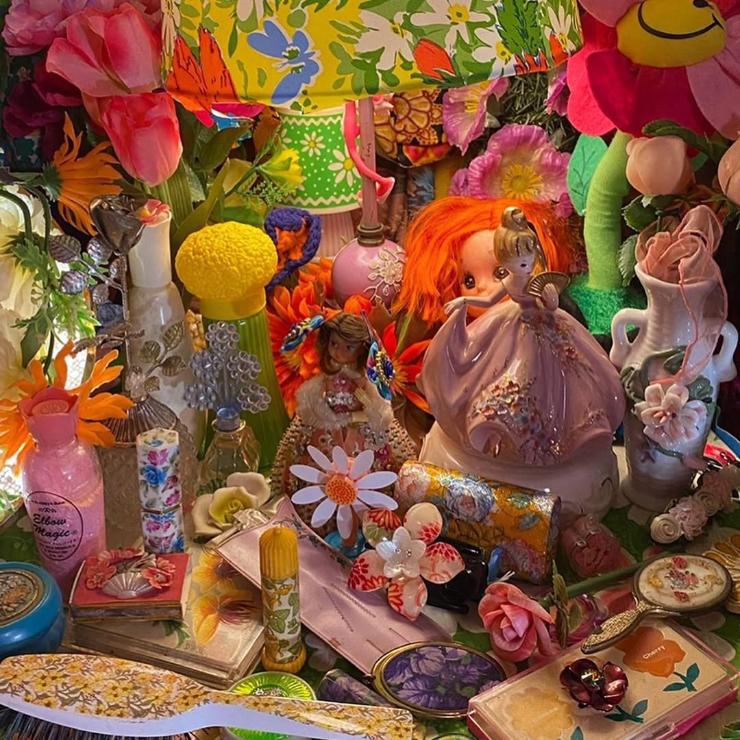 此外,Portia Munson 也喜歡以「層疊」和「密集」的形式創作,將物品以繁複且有機的方式堆砌,產生強烈的視覺層次感,《The Garden》這件作品便是一個典型的例子。這是一間被花花綠綠吞噬的臥室,堆滿碎花洋裝、絨毛玩偶及大量人造花,夢幻的同時又壓迫得令人不安。