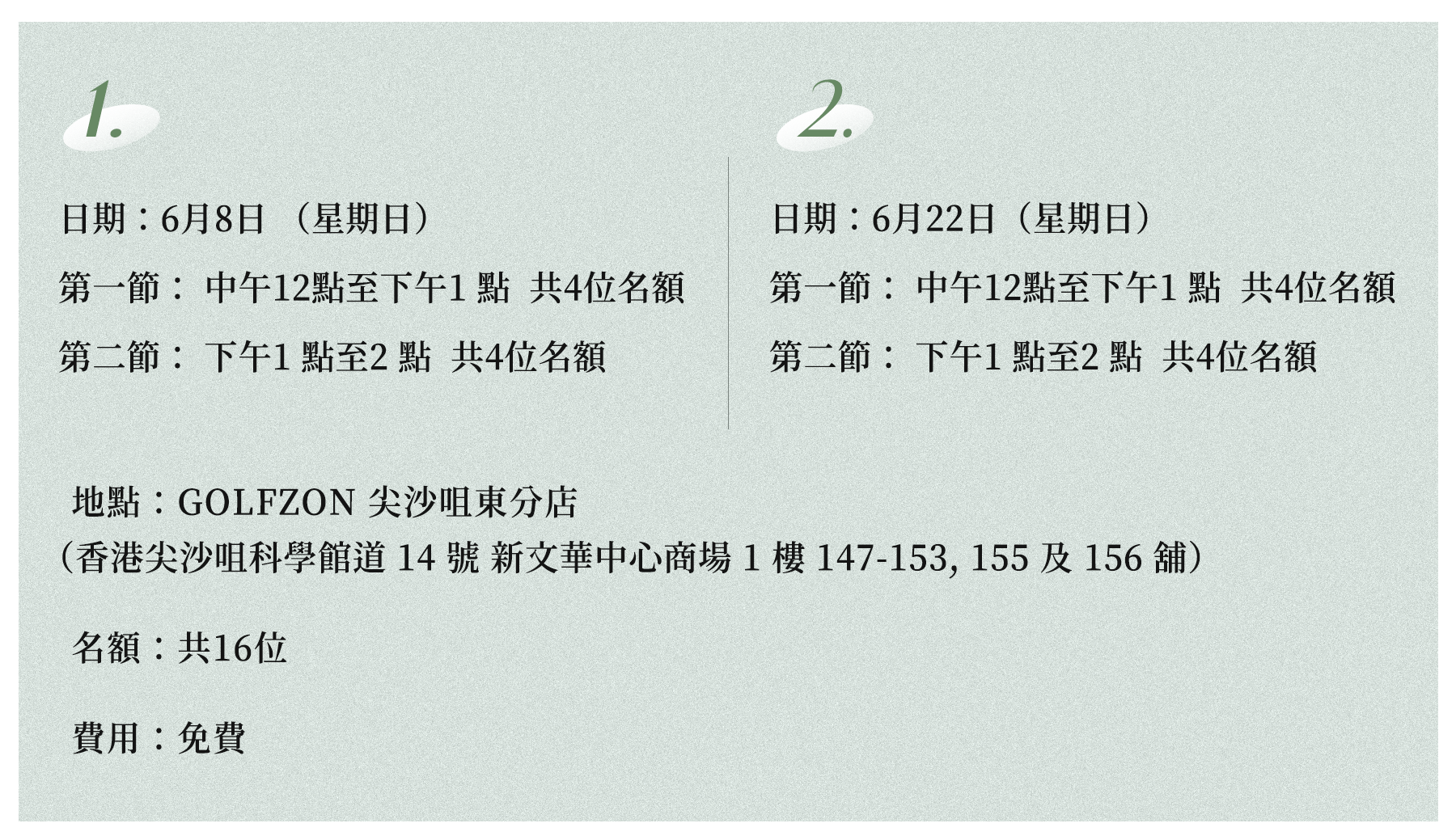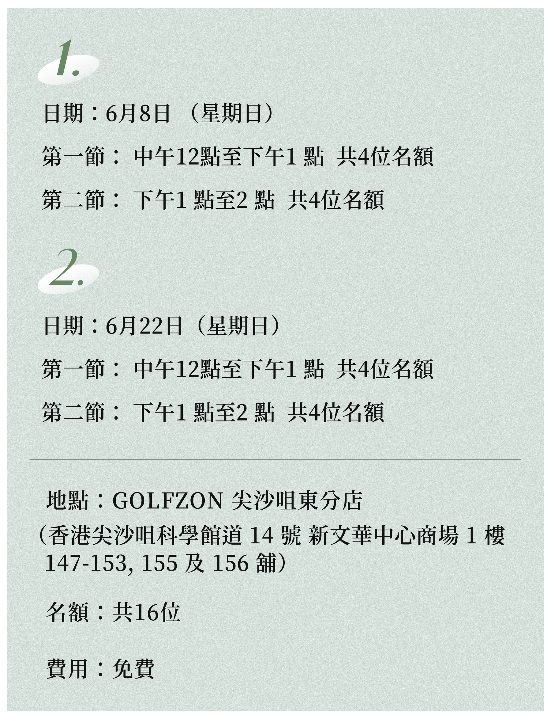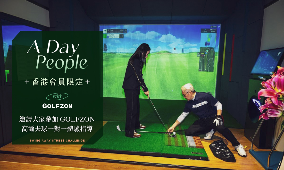 GOLFZON 現特意為 A Day People 香港會員提供體驗班,邀請 A Day People 會員一起來參加一場一對一高爾夫球指導, 享受SWING AWAY STRESS 的樂趣,歡迎報名。