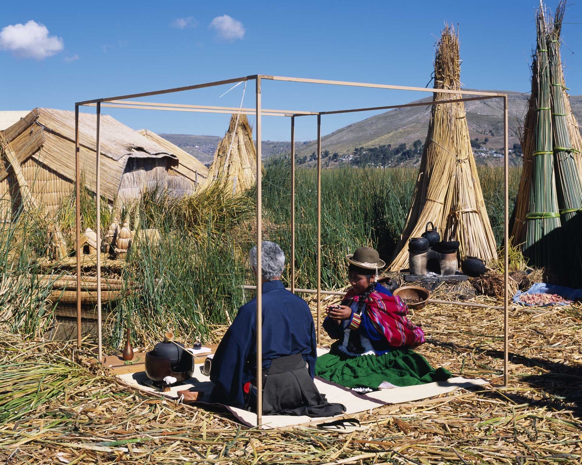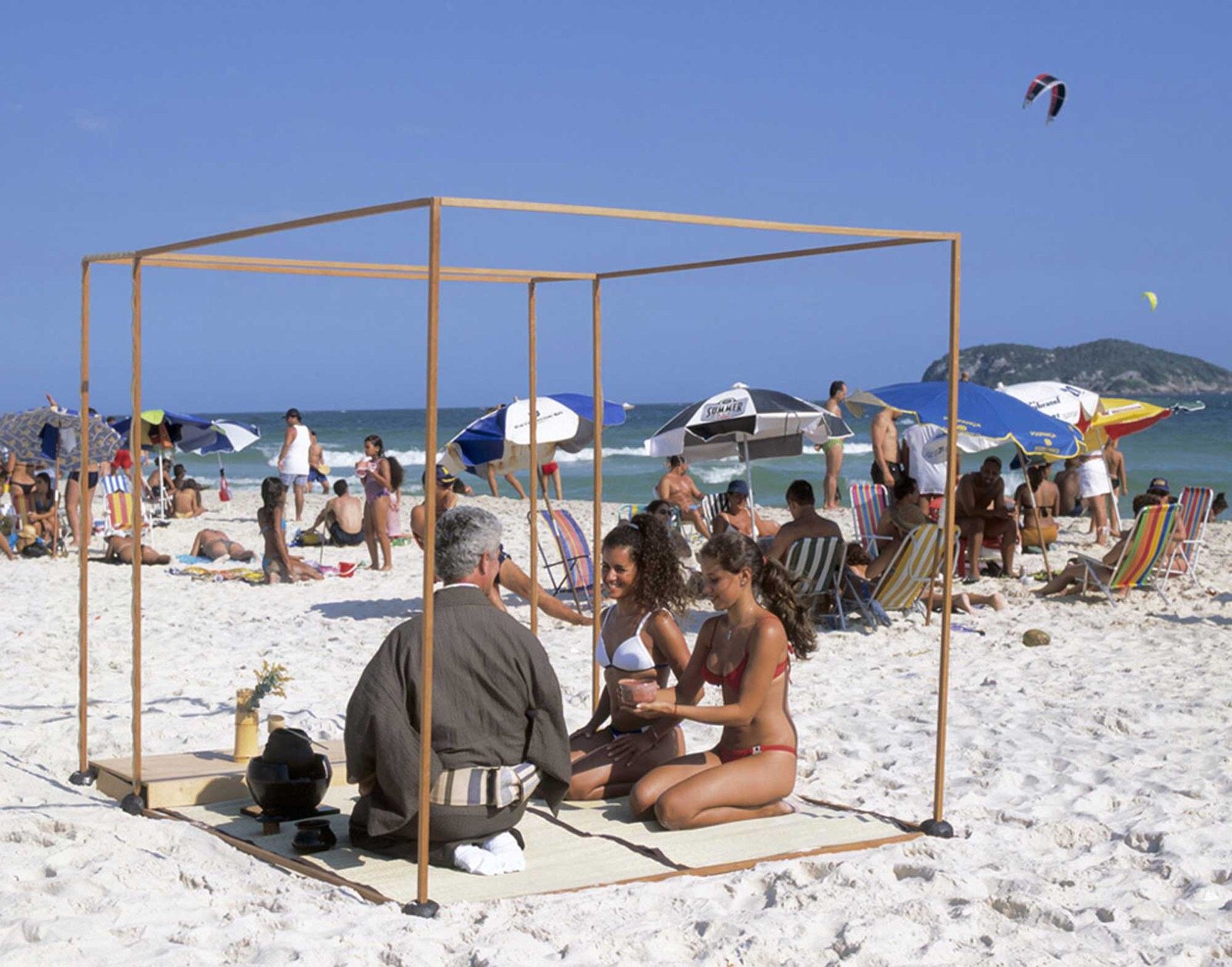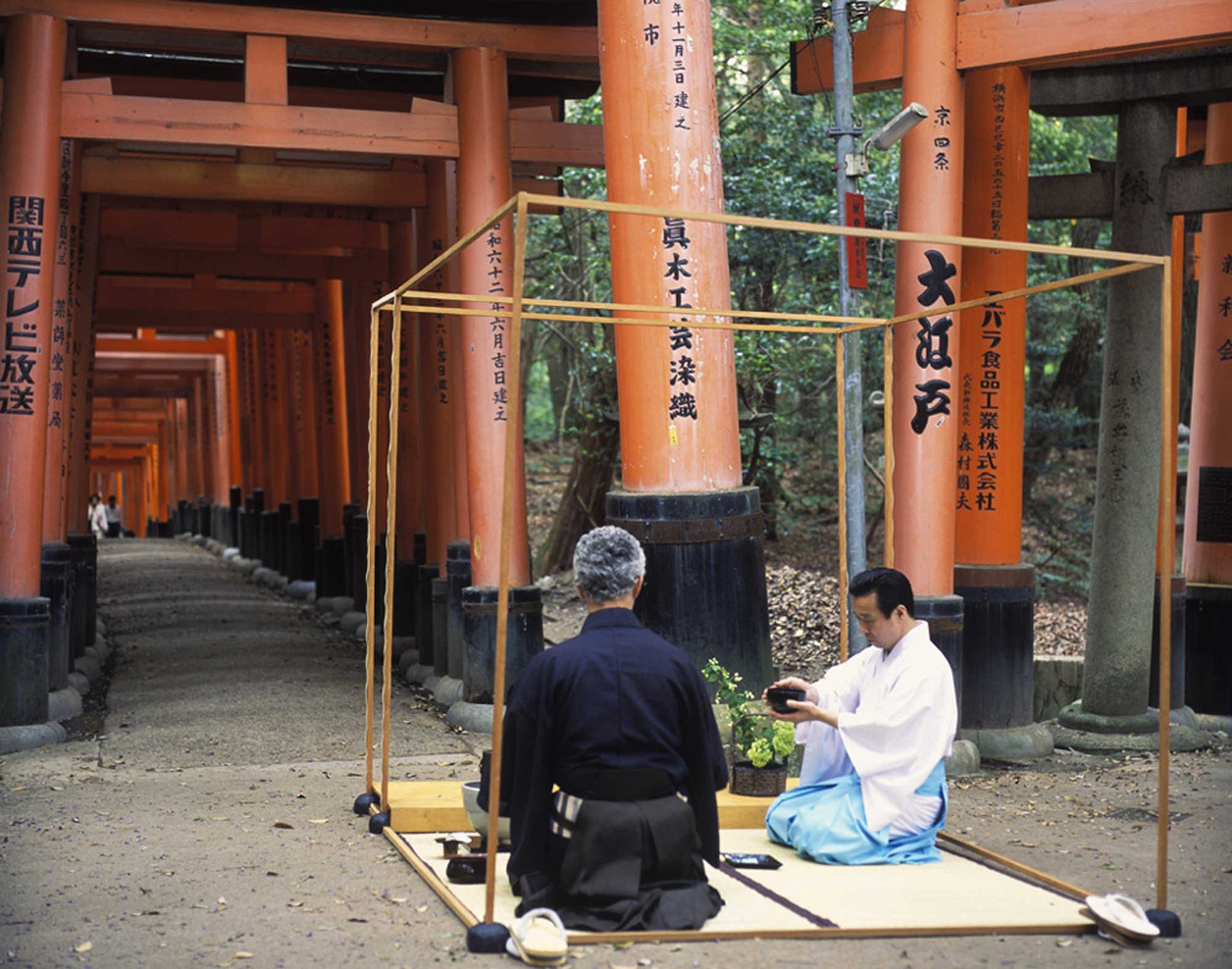 這些茶室是以木頭和金屬製成的簡易立方體結構(Tea Cube),像一個小小的框景,在荒涼或繁忙的場景中顯得格外突兀。方塊空間裡,Sernet 穿著和服,在裡面進行簡化版的日本茶道儀式,邀請陌生人進來,一起喝杯茶。