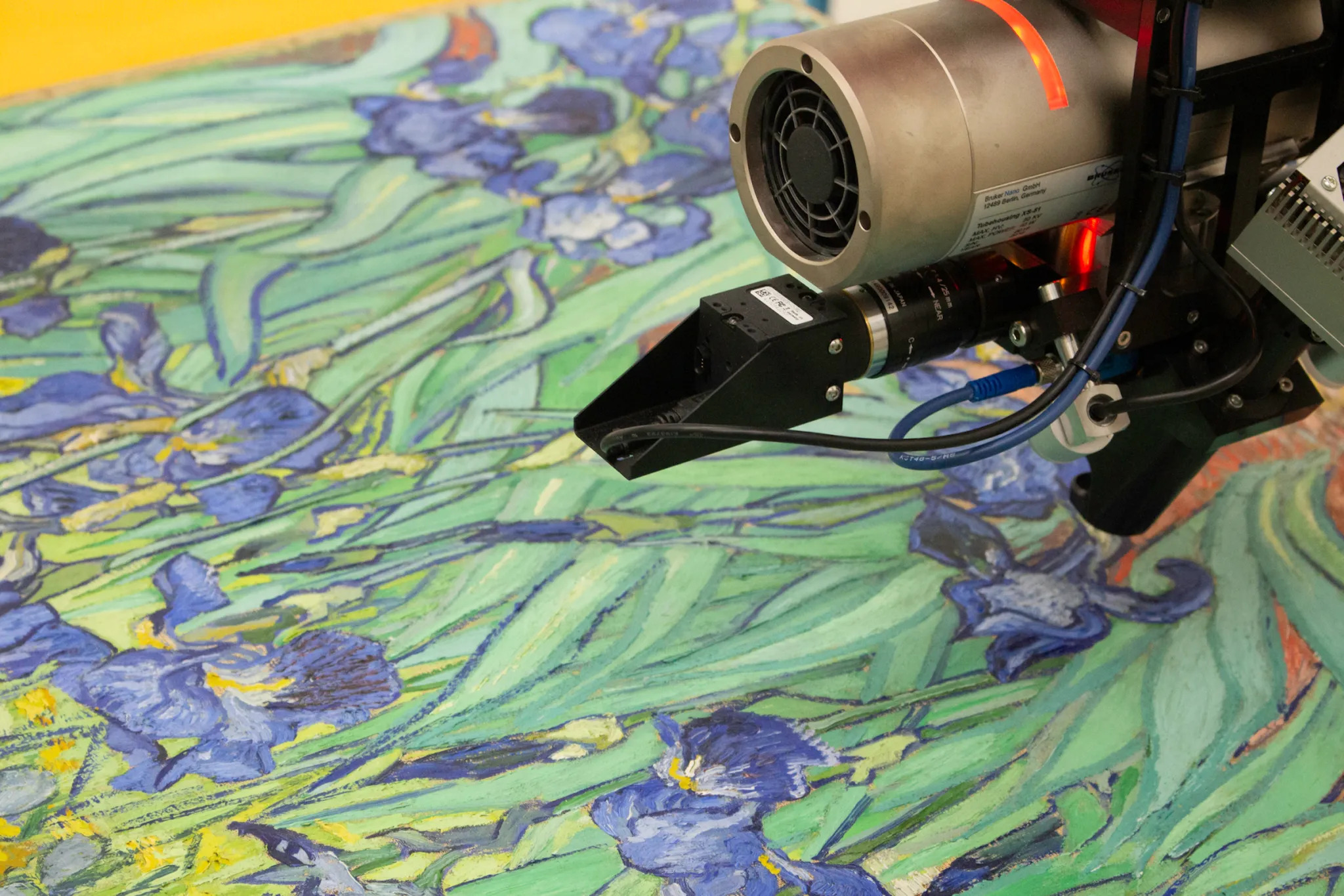 研究發現,梵谷當時是以藍色混合一種名為「天竺葵紅」(Geranium Lake)的紅色顏料來創造紫色,這種紅色顏料對光極為敏感,很容易褪色。在使用 MAXRF 技術掃描後發現,這種紅色顏料含有溴元素,溴會隨著時間分解,但仍然會殘留在畫作中。
