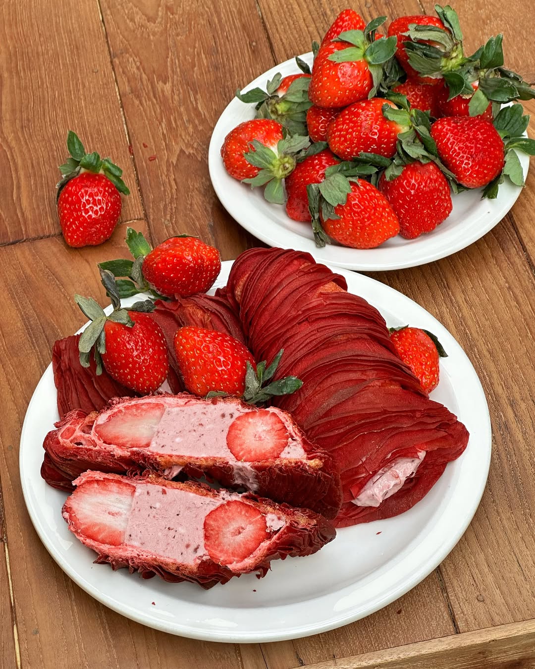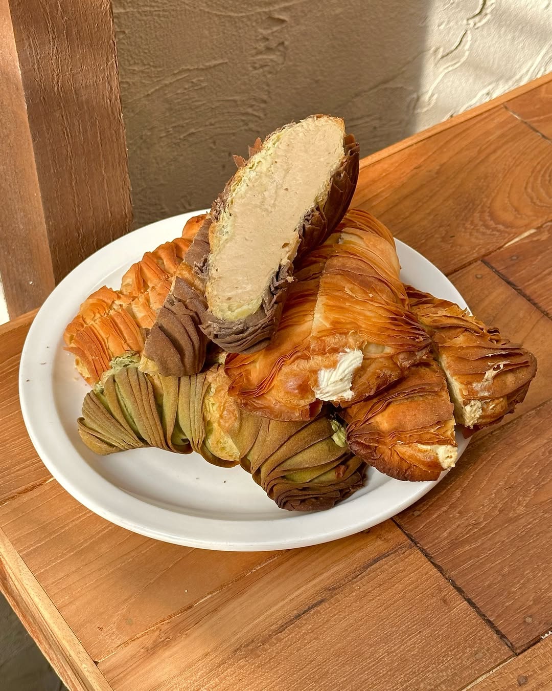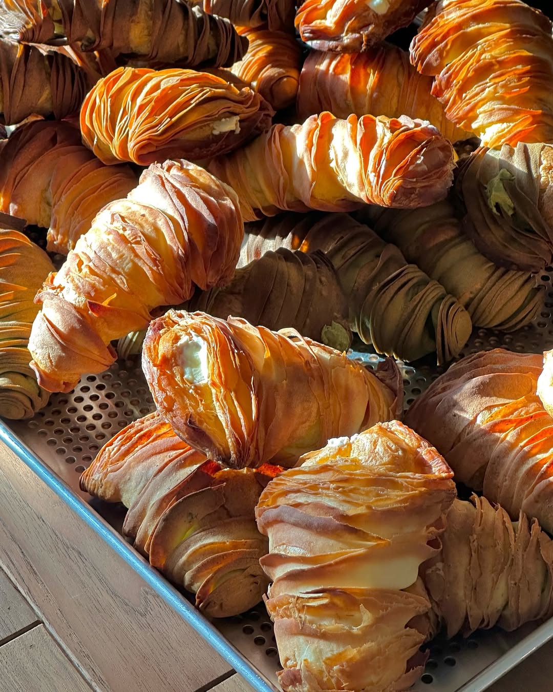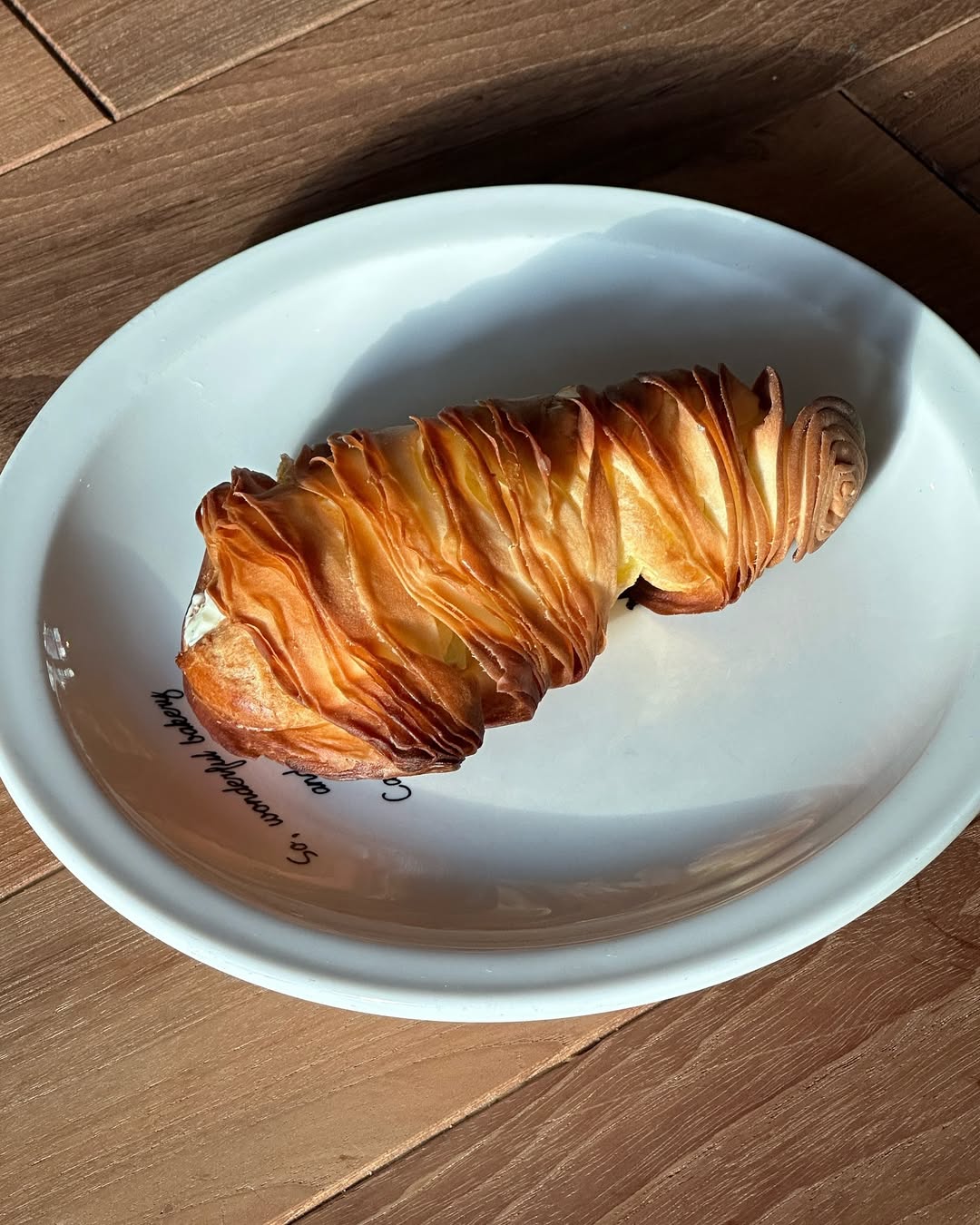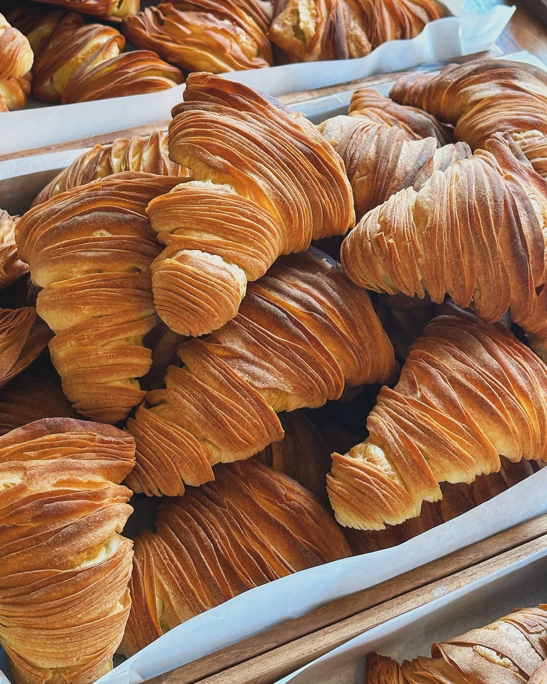 外皮由數十層超薄麵皮層層堆疊,經過反覆擀壓與摺疊,創造出如紙片般酥脆的口感。比一般的千層酥硬,更不是鬆軟的可頌麵包,入口會聽到清脆「咔嚓」聲,紮實硬脆,連店家都特別提醒要「小心食用」。