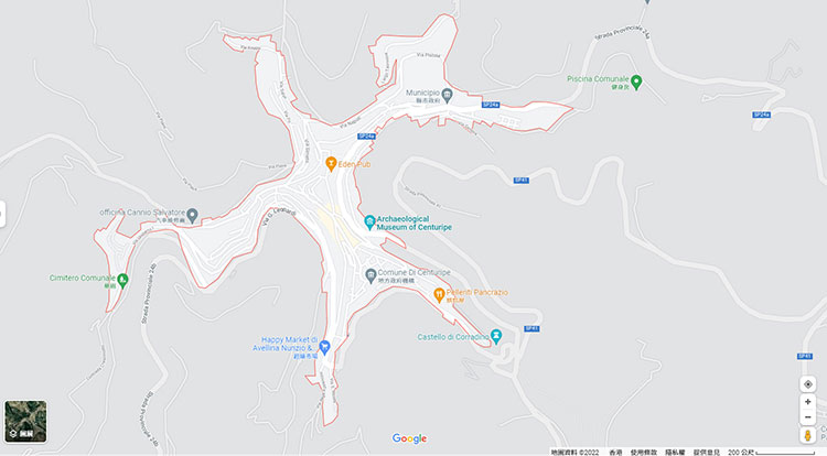 空拍圖上的 Centuripe 看起來就像一尊大字型躺平的巨人,許多人以為是刻意人造,事實上一切都是巧合。當初城市規劃是以中心往四周擴建,但地勢陡峭蜿蜒,順著地形剛好只能向五個方向延伸,形成如巨人四肢般的村莊地貌,獲得「巨人之城」(Giant of Sicily)的稱號。