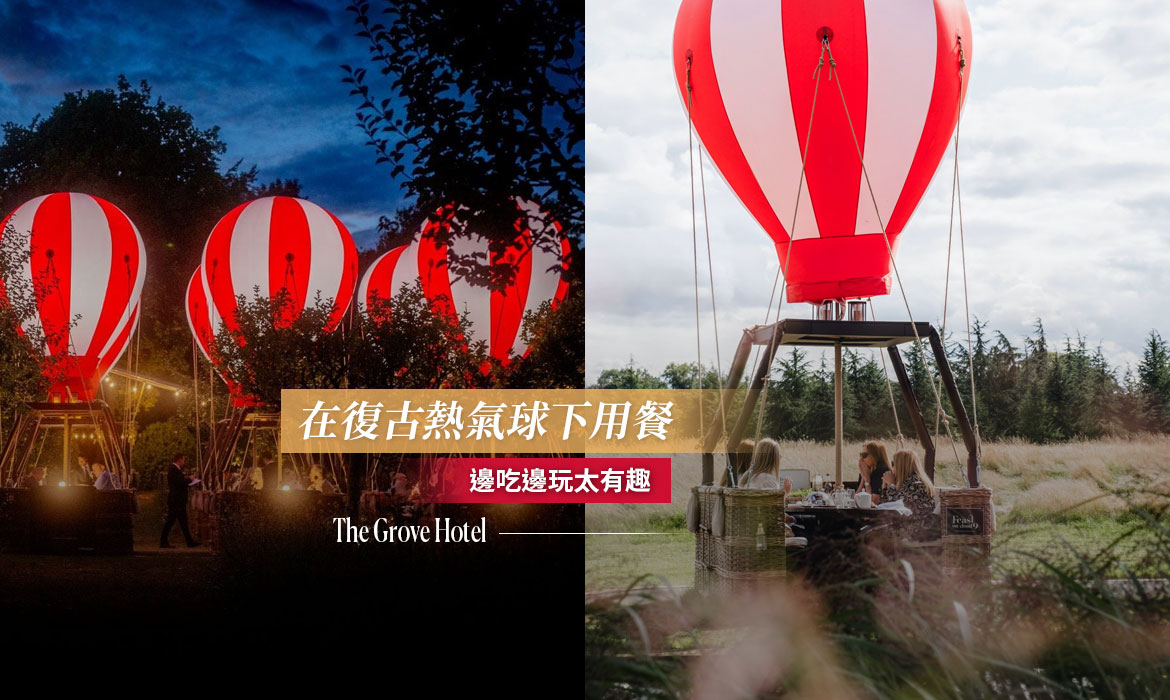 The Grove Hotel 是位於英國赫特福德郡的五星級豪華度假村,坐落於佔地 300 英畝的壯麗園林中,距離倫敦僅約一小時車程。擁有頂級高爾夫球場和水療設施,更以創意的餐飲體驗聞名,尤其夏季限定的「熱氣球餐桌」,每年推出都會大受歡迎,掀起一波打卡潮。如果今年來不及,先認識一下預先做功課吧!