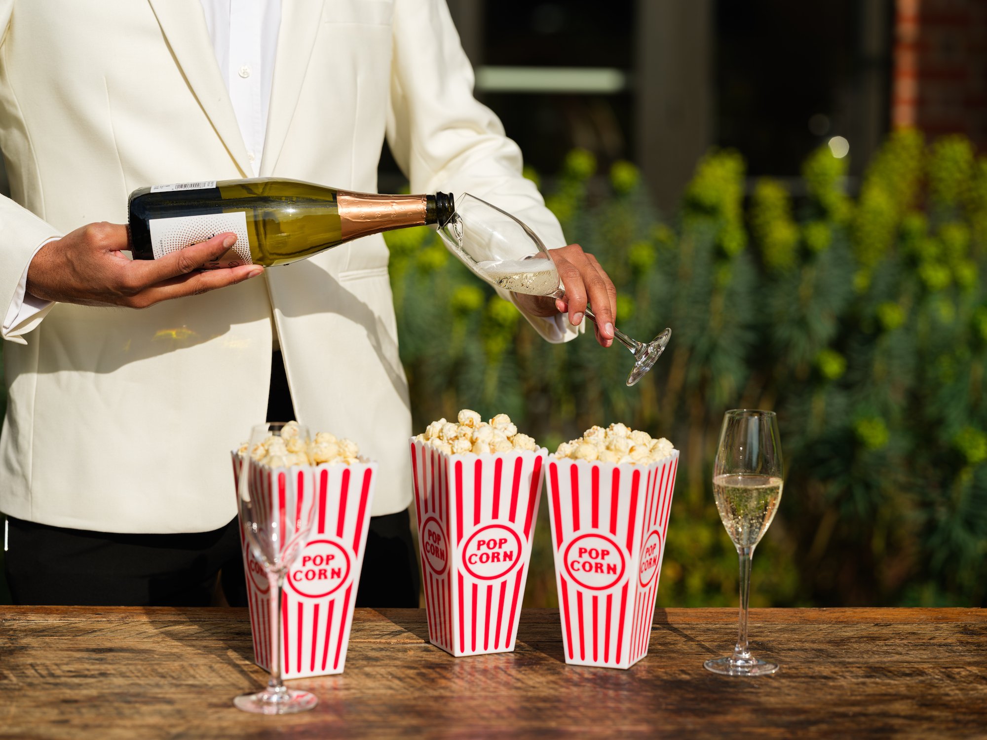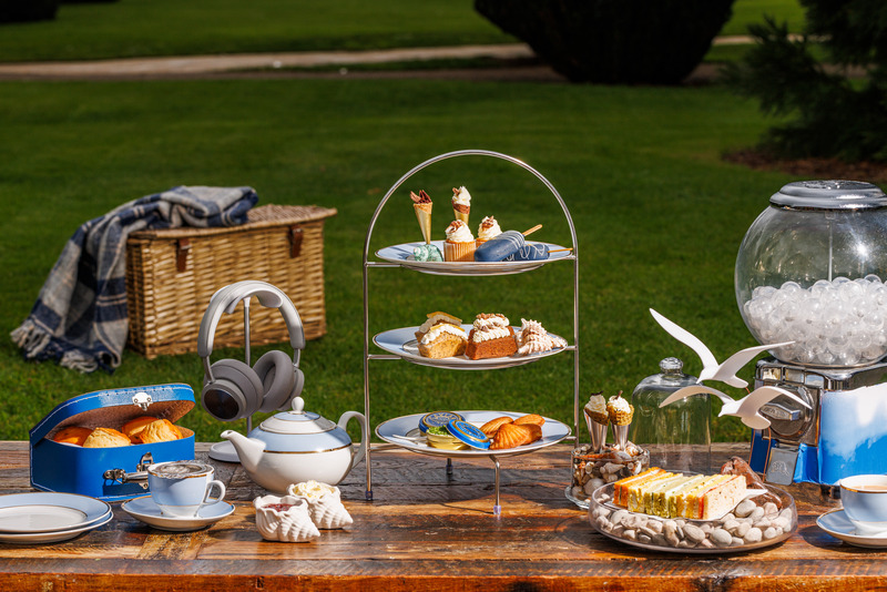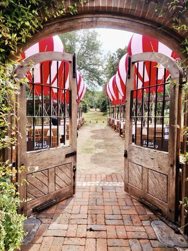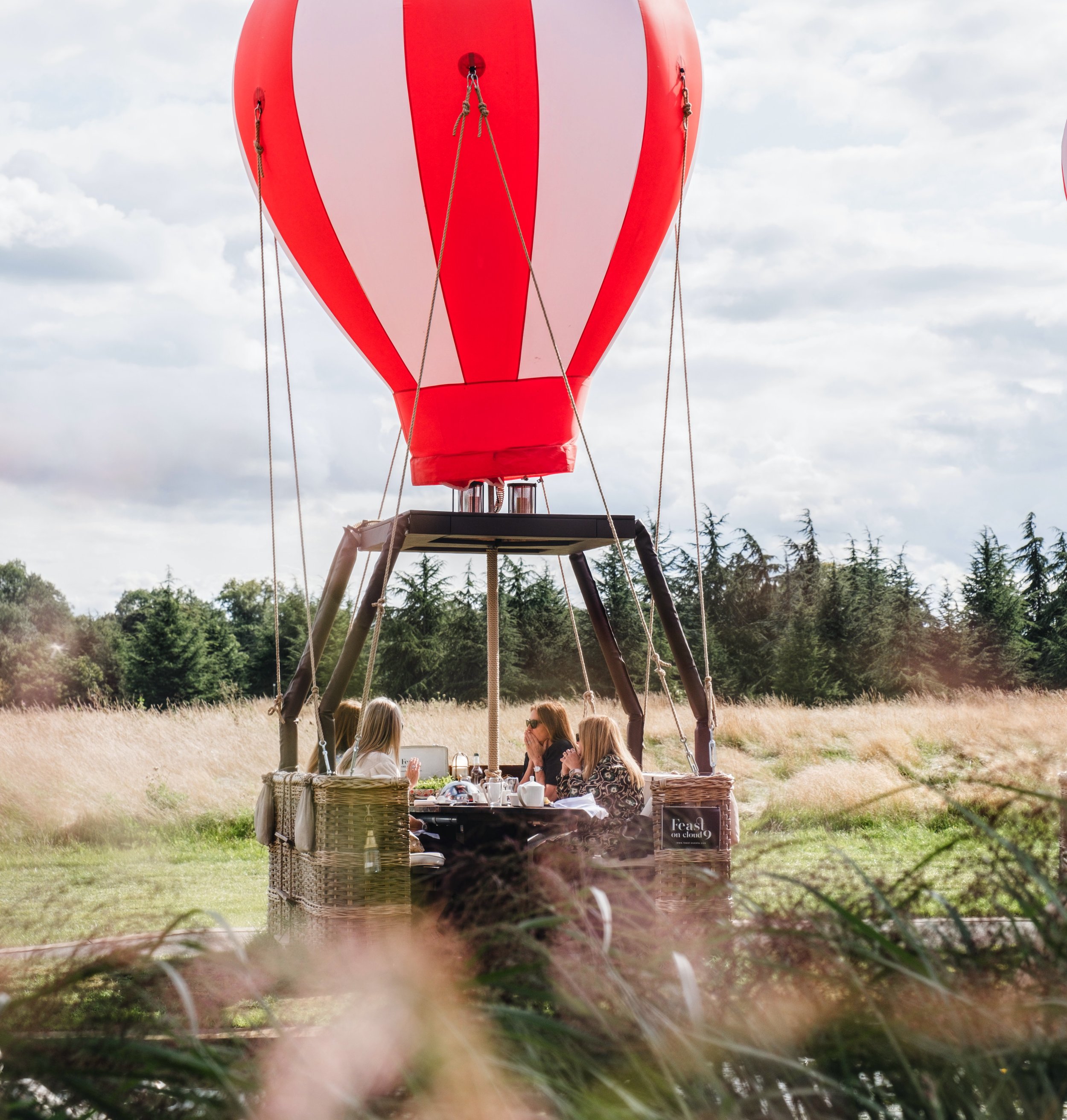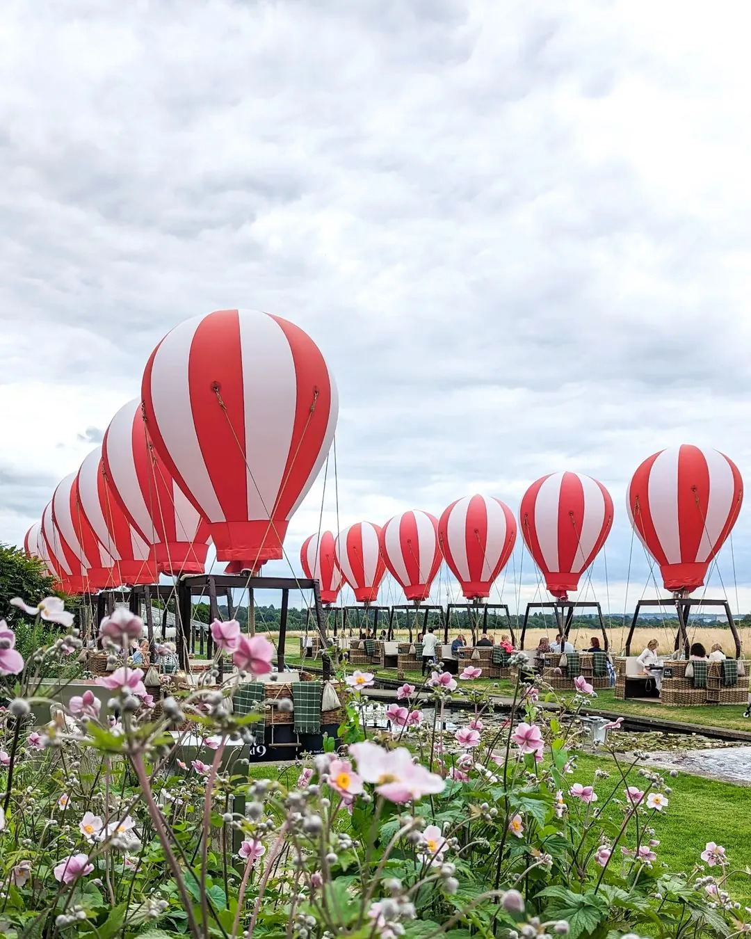 14 個紅白相間的復古熱氣球,漂浮在優雅的英式花園的翠綠草地上,下方有可容納 4 至 6 人的藤編用餐籃,桌面有可愛裝飾,座椅則鋪著柔軟毛毯。雖然氣球不會升空,但坐進其中時,彷彿就被輕輕拎起,還以為誤入《愛麗絲夢遊仙境》的夢幻場景。