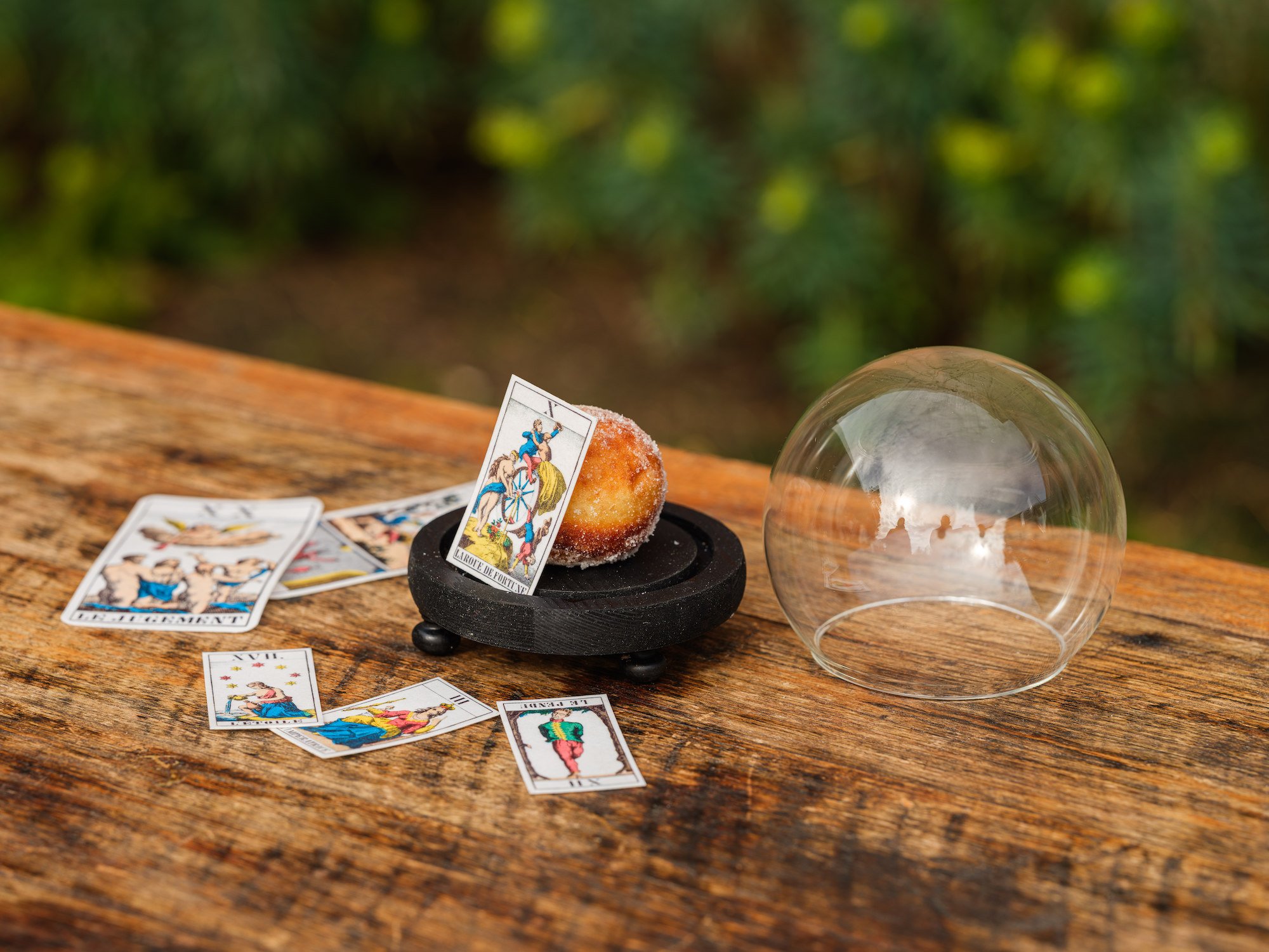 像是開胃點心「猜猜什麼口味爆米花」;前菜「輸贏洋蔥醬鴨肝」,先玩一場 Hook-a-duck 套鴨遊戲(英國傳統嘉年華遊戲,用鉤子嘗試釣起漂浮的小塑膠鴨,通常每隻鴨子底部會標示號碼或獎品,依照結果兌換相應的獎品)決定要蘑菇醬或是黑胡椒醬。