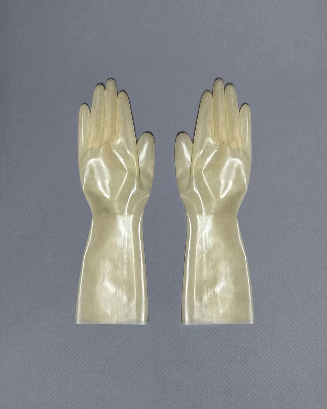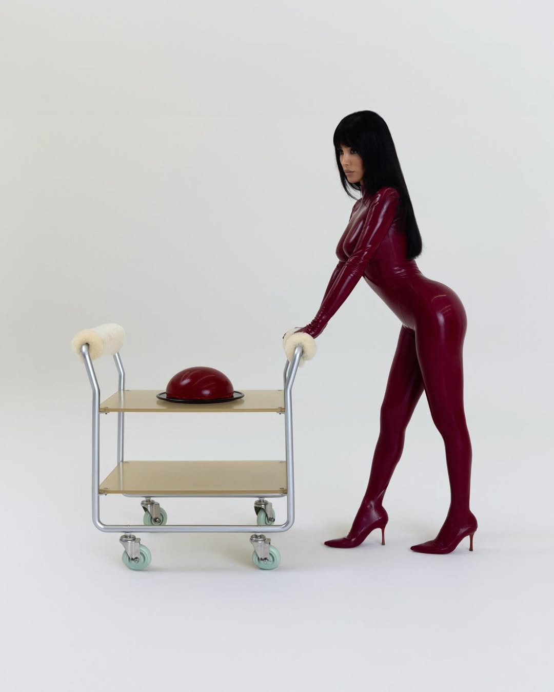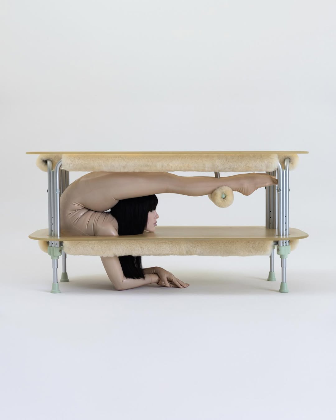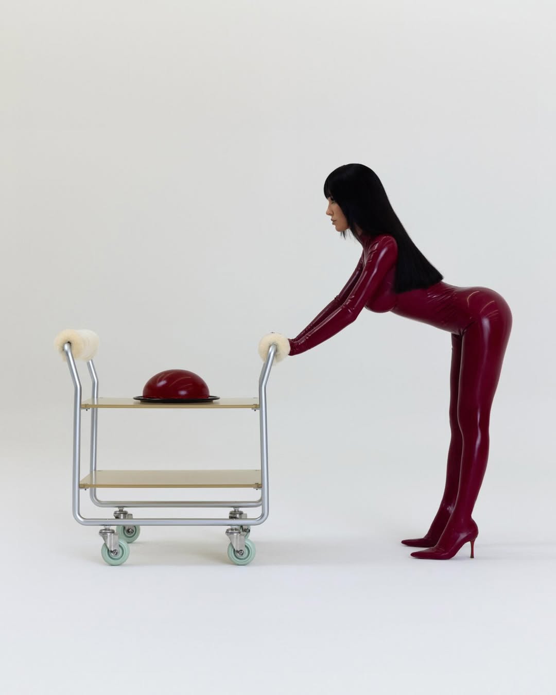 《BIO POP》清晨六點半直播上線,影片畫面一開始就讓人有點不舒服,只見 Bianca 穿著一套深色乳膠衣,在一個全金屬的冰冷廚房裡烤蛋糕。蛋糕完成後,Bianca 放到推車上,然後走到房間另一端,此時原本遮住的簾幕緩緩拉開,出現令人屏息的場景:多名「女性」被固定在醫療輔具般的家具上,身體以不可能的角度彎折,成為桌子、椅子、甚至吊燈的一部分。這些「人形家具」全都戴著面具、穿著仿裸體的乳膠衣,看起來像蠟像,卻都是真實的表演者。
