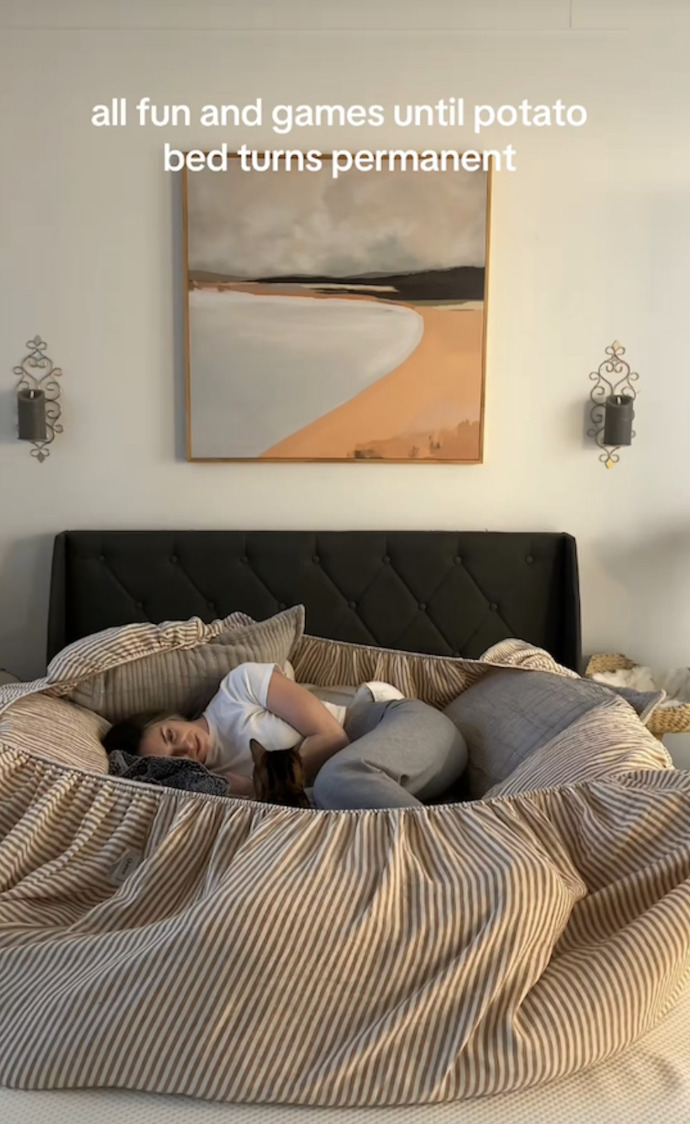 如果你常有睡眠品質不好的困擾,最近在 TikTok 上掀起熱潮的 “Potato Bed” 睡眠法,或許值得你試試看。「馬鈴薯床」這名字聽起來有點古怪,但它不是要你睡在馬鈴薯堆裡,而是教你把床佈置成一個類似「烤馬鈴薯」內餡般的溫暖小窩,讓你在全方位包裹的幸福感中沉沉入眠。