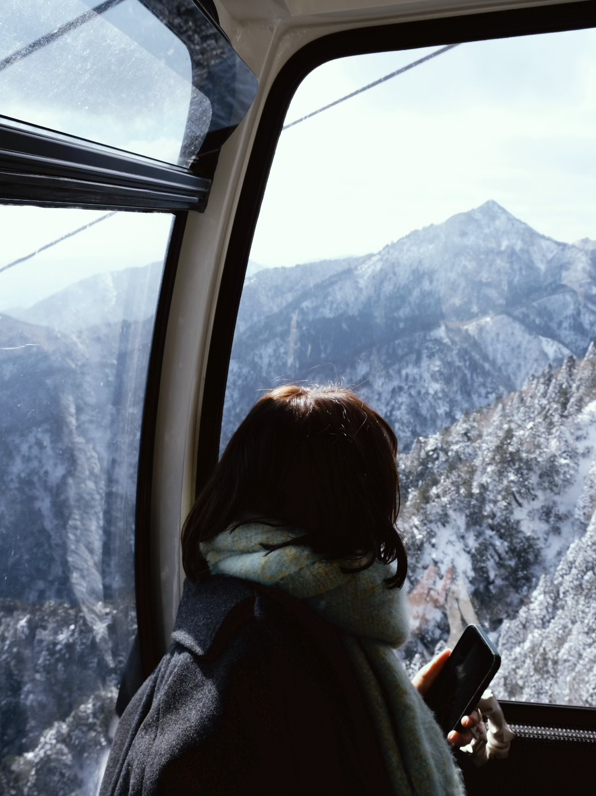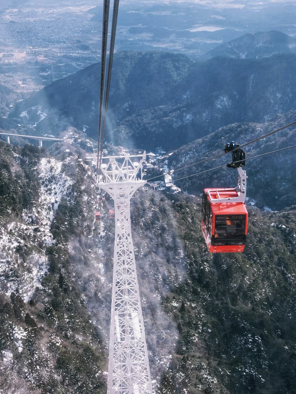 搭乘御在所纜車是一場冬日的視覺饗宴,隨著纜車慢慢爬升,窗外白雪皚皚的山脈在眼前鋪展開來,途中還會經過一座高達 57.7 公尺、號稱全日本最高的白色纜車塔,支撐著鋼索跨越深谷,看出去的景色超級壯觀。到了山頂,如果天氣剛好,會看到整片宛如仙境般的樹冰,晶瑩剔透的冰晶掛滿枝頭。