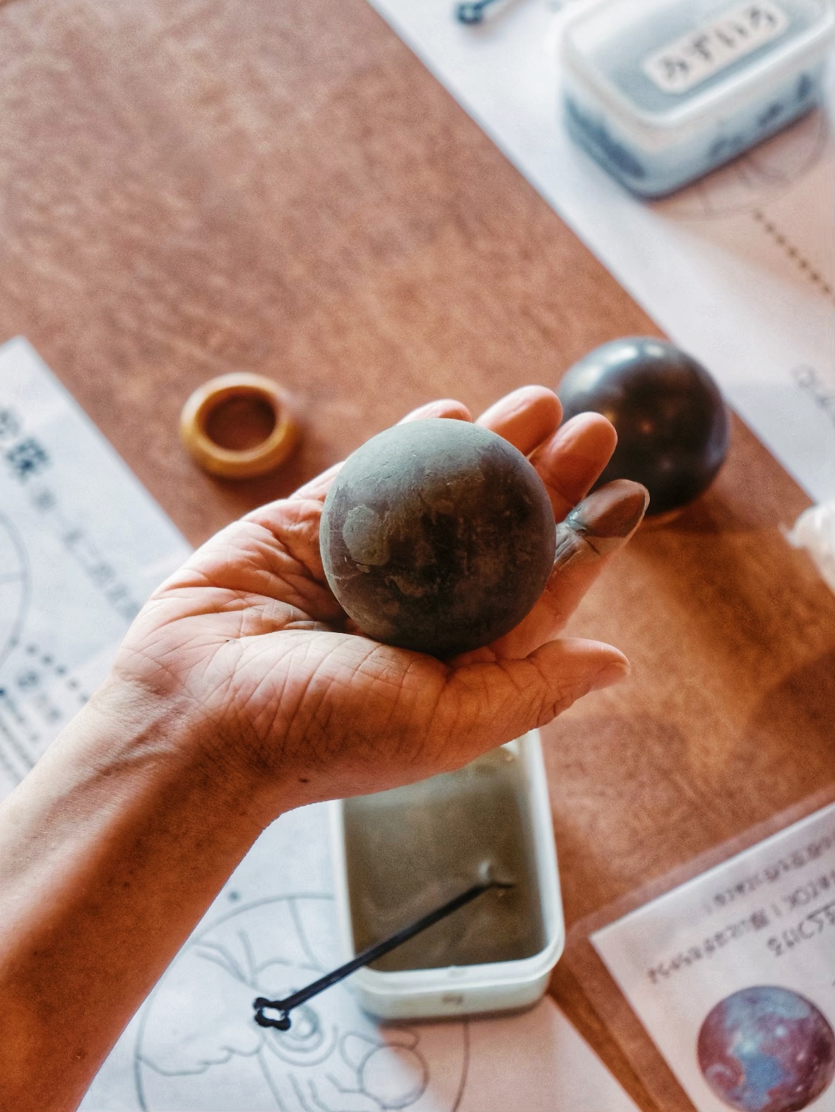 這裡也有一些手作課程,我參加了 DIY「發光泥球」的活動,一人拿到一顆用特殊黏土做的球,用小工具不斷摩擦球體表面,讓土的微粒重新排列,磨著磨著,原本灰灰的泥球,竟像拋光後的寶石一樣,慢慢發出閃耀的光澤!指引人員說泥球要持續磨個兩週才會大功告成,要我們帶回家繼續磨,結果後面的旅遊行程,我有事沒事就把這顆「龍珠」拿出來磨,莫名的很療癒。