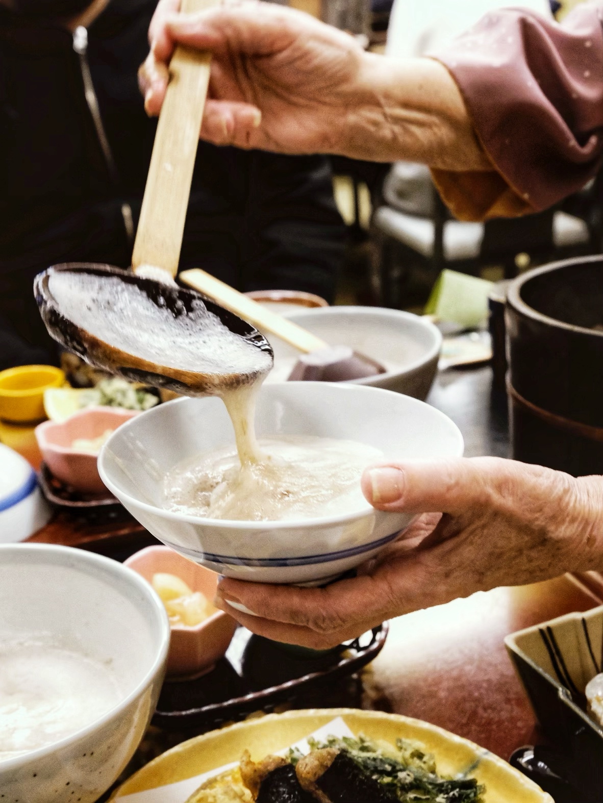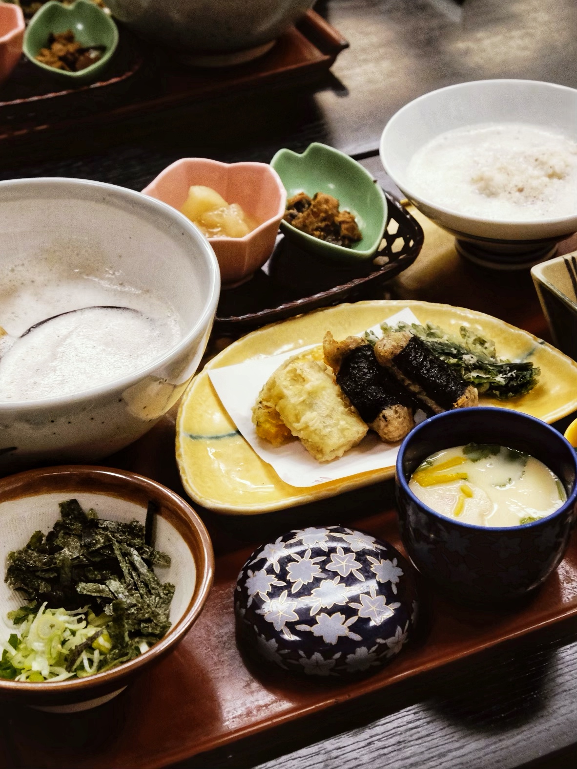 套餐裡的「自然薯泥拌飯」,餐廳婆婆桌邊服務,把黏液般的白色山藥泥淋到熱騰騰飯上,再撒上蔥花,鹹香中帶著自然的甘甜。還有一道外表看起來超像炸排骨的「炸山藥餅」,以及外酥內綿的炸山藥塊,甚至飯後甜點都是口感綿密的山藥布丁!