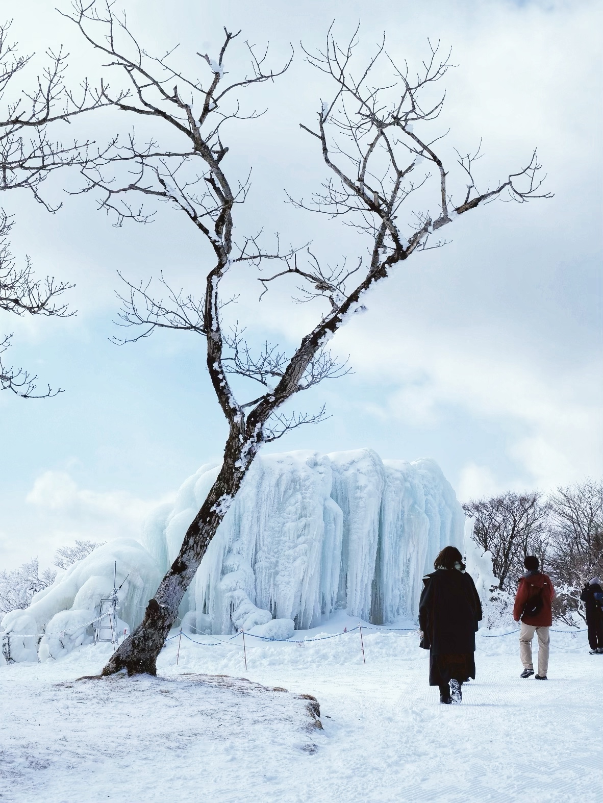 在山頂散步很放鬆,除了有雪地裡的鳥居,還有一座宛如藝術品的人造冰瀑,以及一座面對群山的盪鞦韆,坐在鞦韆上擺動,那風、那視野、那速度,讓人開心的忍不住不停咯咯笑。這裡很適合跟朋友慢慢走、隨便聊,要是真的太冷,就去買杯熱飲捧在手心,在銀色世界裡喝一口熱的,那種幸福感真的無敵。