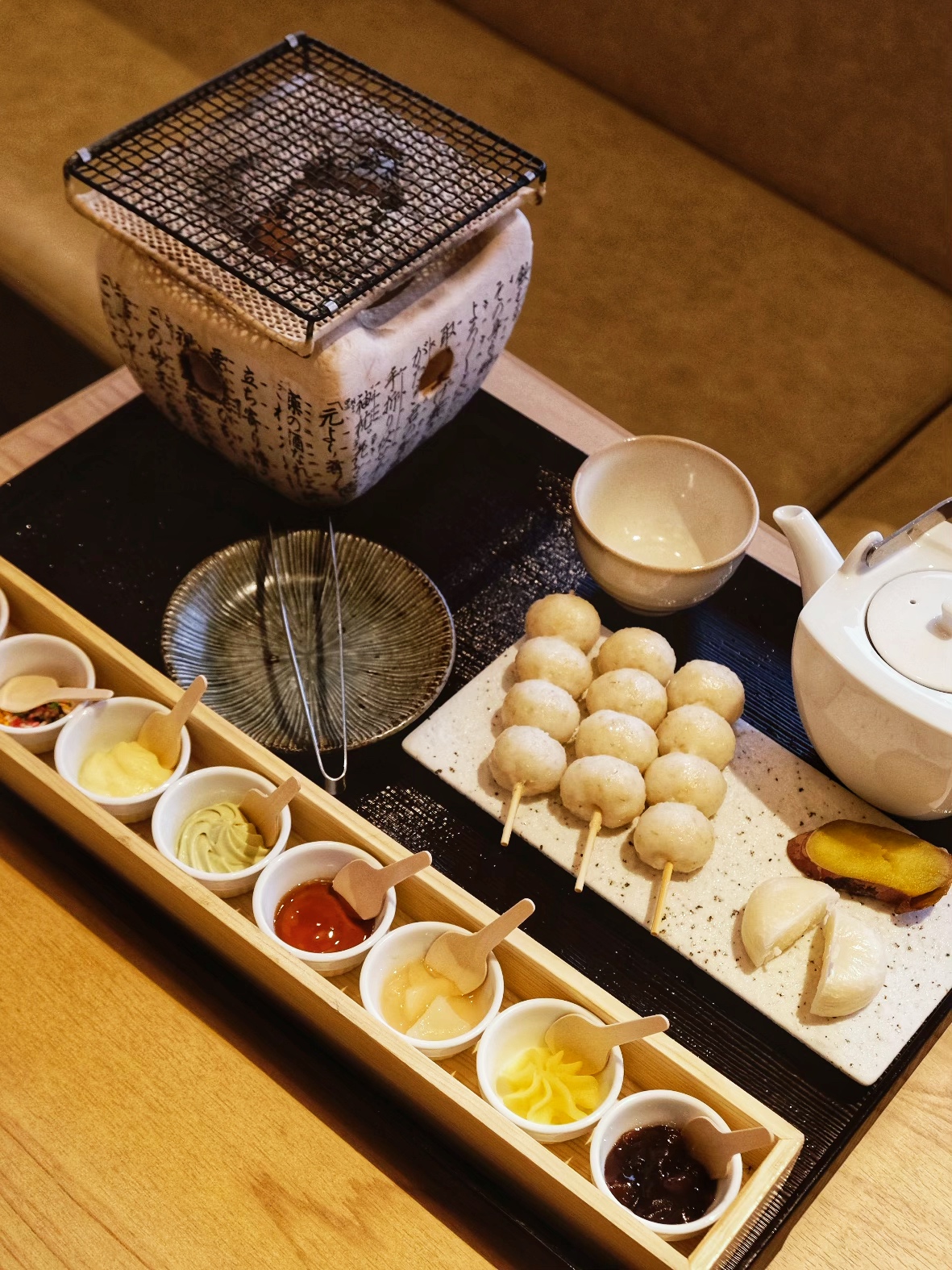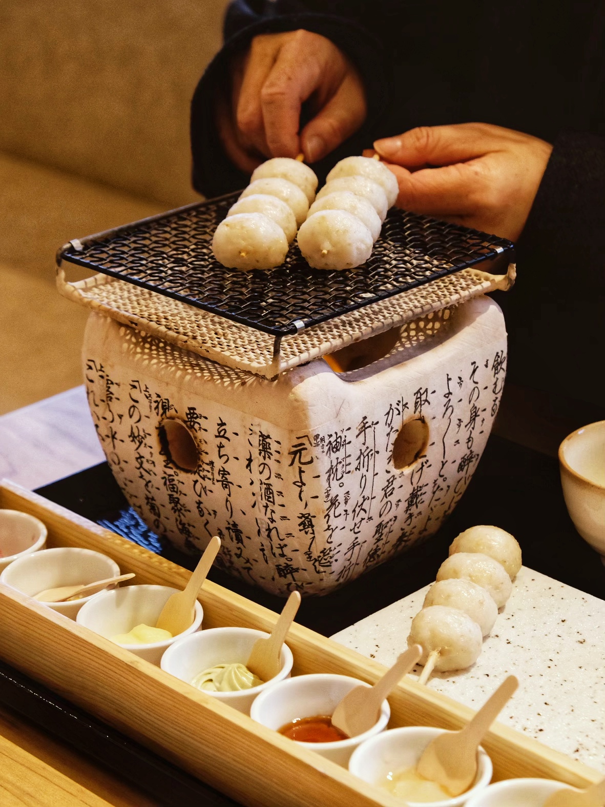 岐阜城下,有一家以烏龍麵聞名的名店 Gifu-jo Rakuichi,不過最近這家店在網美圈爆紅的,是店裡賣的「手烤糰子」套餐。這道菜上桌時視覺超級澎湃,附有一個專屬的小烤爐,配上三串白嫩糰子,還有一排色彩繽紛的各式醬料,包括濃郁的奶油、新鮮的草莓、經典的甜醬油,甚至還有抹茶和紅豆泥等。看著糰子在炭火上烤出微焦的金黃色澤,整個很有儀式感。你可以依照口味自己組合風味,這家的糰子口感讓我驚艷,咬下去是極致的軟糯,甚至還能吃到一點米粒的顆粒感。濃濃米香和不同醬料佐料搭配,每一口都讓人歡喜。
