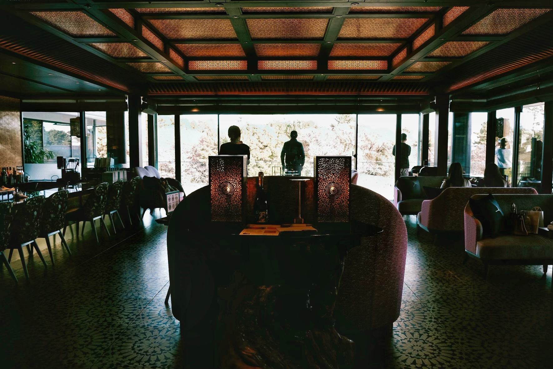 在古樸鄉村的落地窗前,品嚐黑夜雪景中的炭烤雞料理
